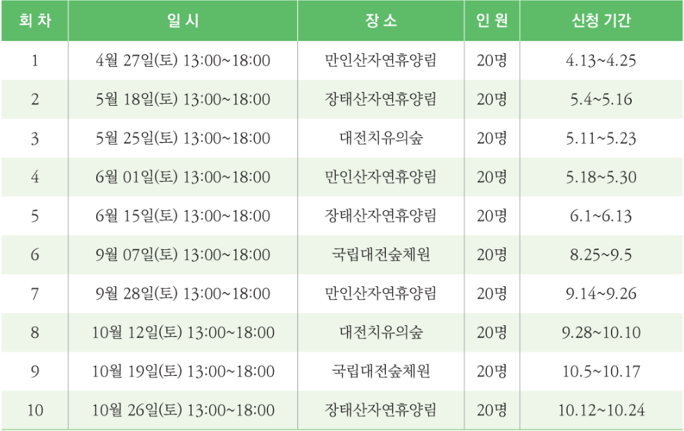 힐링캠프는 만인산 자연휴양림, 국립대전숲체원, 장태산 자연휴양림, 대전치유의 숲에서 진행된다. 구체적인 운영 장소와 일정은 다음과 같으며 참가자는 본인의 일정에 맞춰 원하는 캠프를 선택할 수 있다.