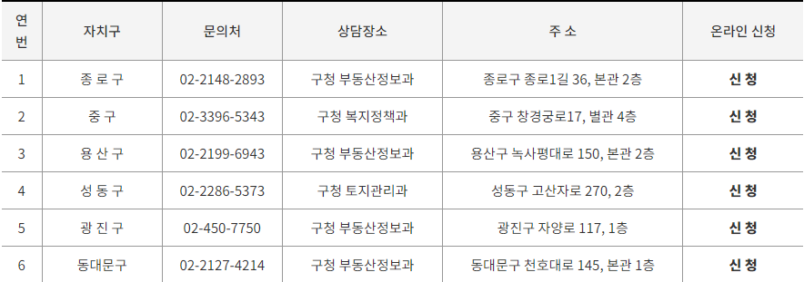 필요시 각 자치구(종로구, 중구, 용산구, 성동구, 광진구 동대문구)로 문의 가능 하며 온라인 신청 또한 가능하다.