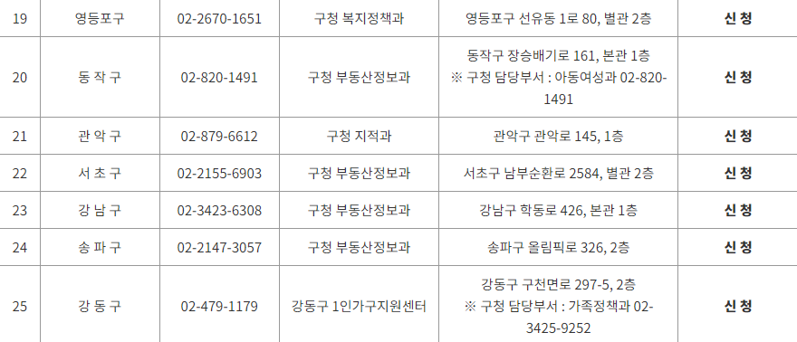 필요시 각 자치구(영등포구, 동작구, 관악구, 서초구, 강남구, 송파구, 강동구)로 문의 가능 하며 온라인 신청 또한 가능하다.