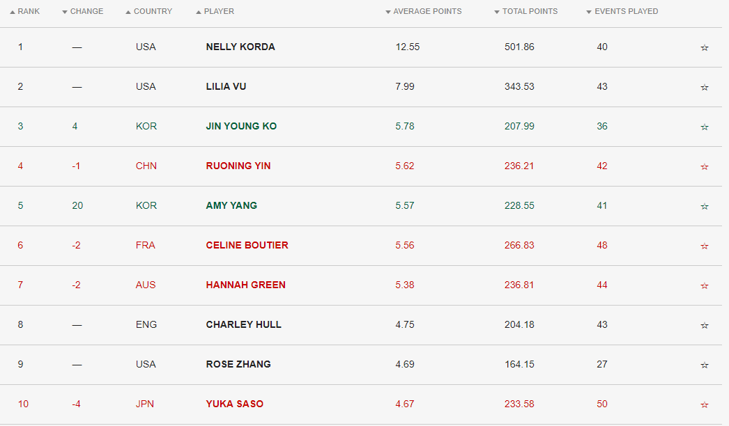 2024년 현재 여자 골프 세계랭킹 톱 10에는 한국 선수들이 다수 포함되어 있다. 넬리 코다(미국)가 1위를 차지하고 있으며, 고진영(한국), 양희영 (한국), 넬리 코다(미국) 등이 상위권에 자리하고 있다. 이들은 꾸준한 성적과 활발한 경기 참여로 높은 랭킹을 유지하고 있다. 현재 랭킹 톱 10 선수들의 활약은 많은 팬들에게 큰 관심을 받고 있다.