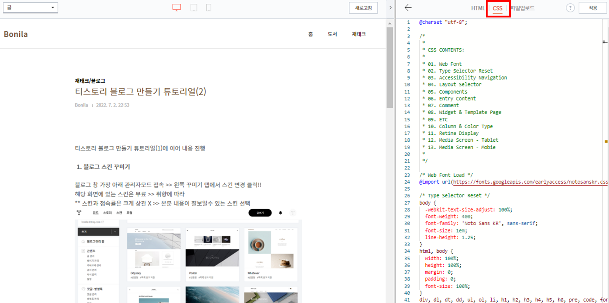 오늘은 스킨 편집을 통해 글씨 크기 및 본문 넓이를 조절 하는 방법을 알려주겠음!