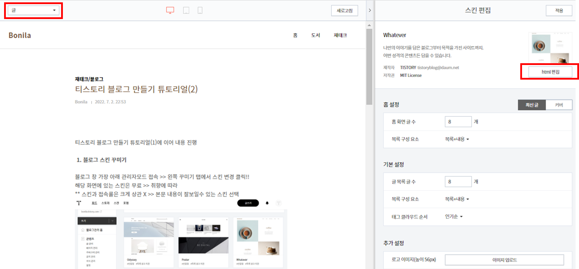 스킨 편집창에서 왼쪽 상단에 수정하고 싶은 내용 클릭(홈/ 글/ 카테고리.. 등 존재)